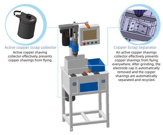 - After grinding, the electrode caps are automatically removed and separated from copper shavings for recycling.
