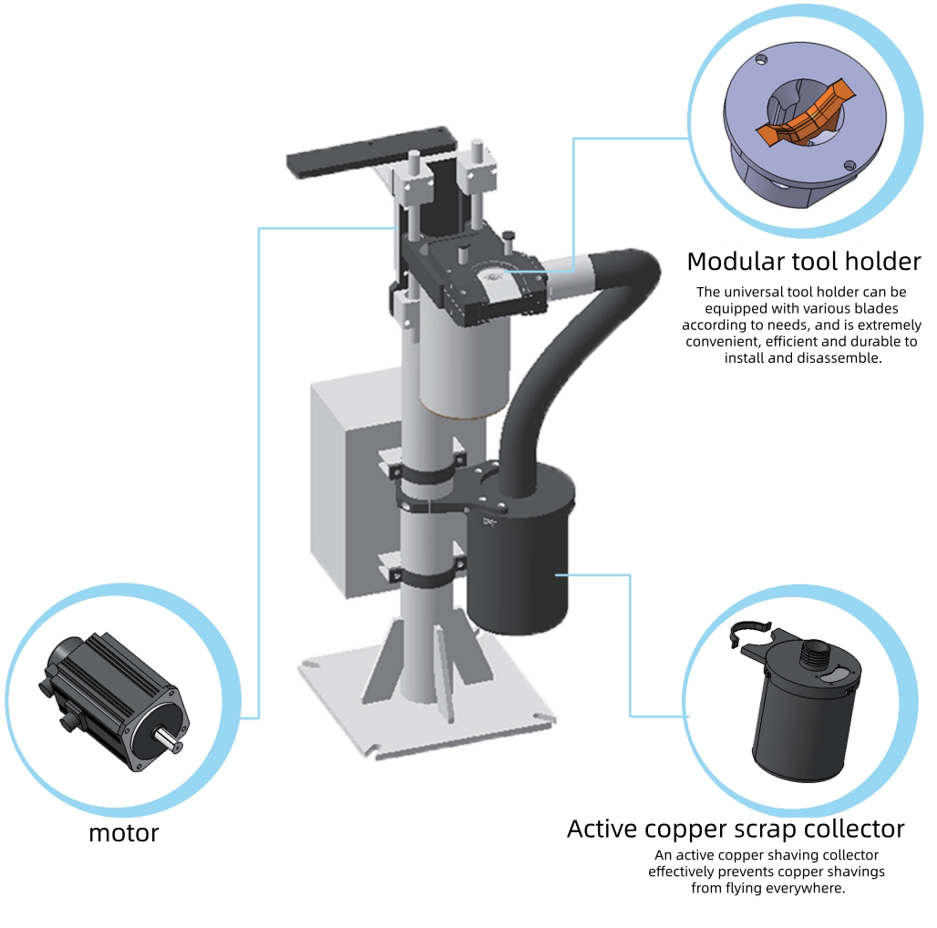 This fixed electrode cap grinding machine employs a high-speed precision grinding disc and intelligent servo pressure control technology. Equipped with a self-developed five-jaw pneumatic assembly/disassembly module, it can accurately clamp, grind, and automatically replace electrode caps of various sizes (Φ13-20mm). The equipment features an independent, large-capacity copper shavings collection system and a self-diagnostic function, allowing for seamless integration into robotic or semi-automatic spot welding stations, supporting continuous, unmanned production. The rated grinding capacity exceeds 60 cycles per hour.