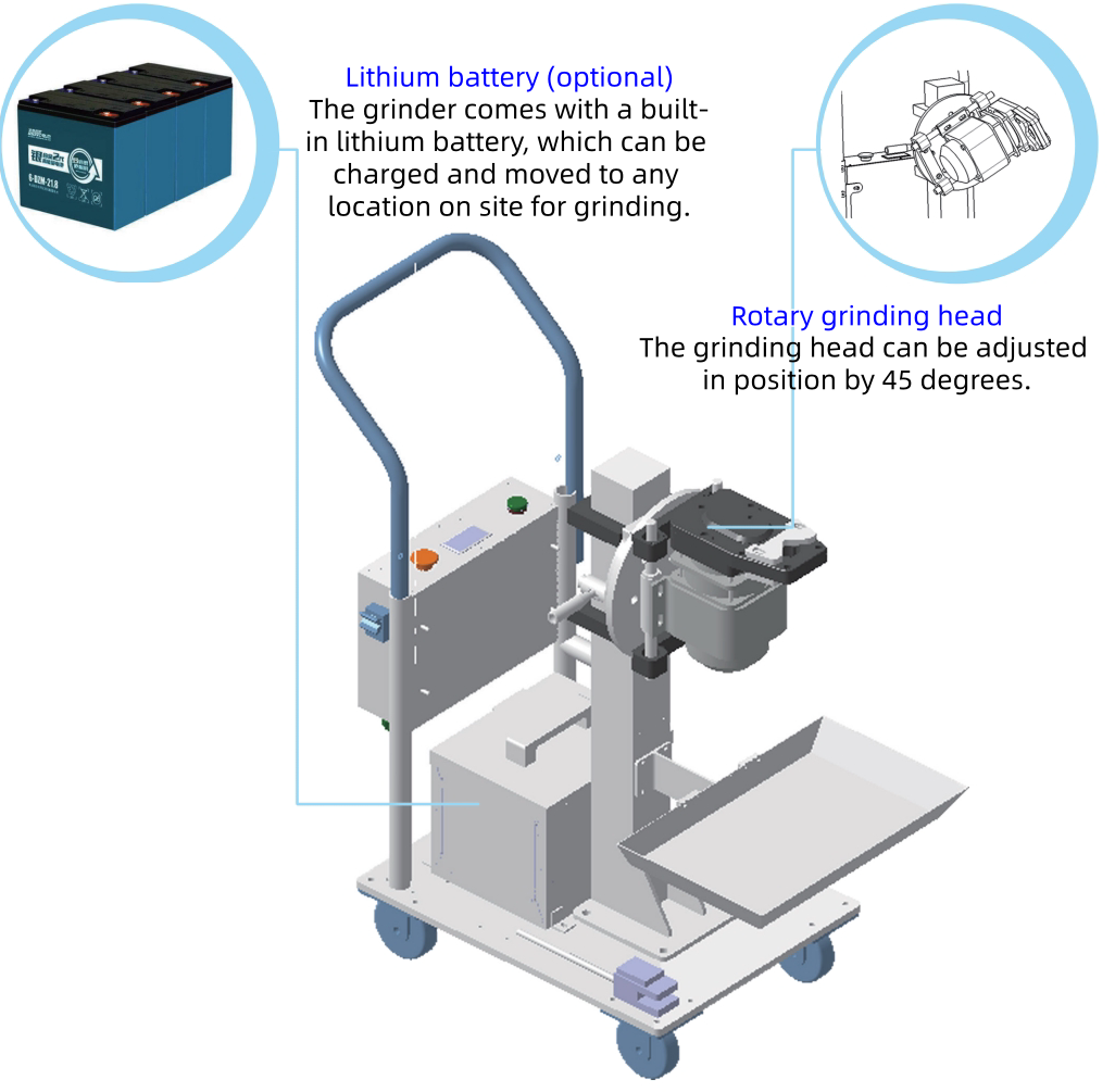 - Equipped with a rotating grinding head, adaptable to both horizontal and vertical grinding methods.