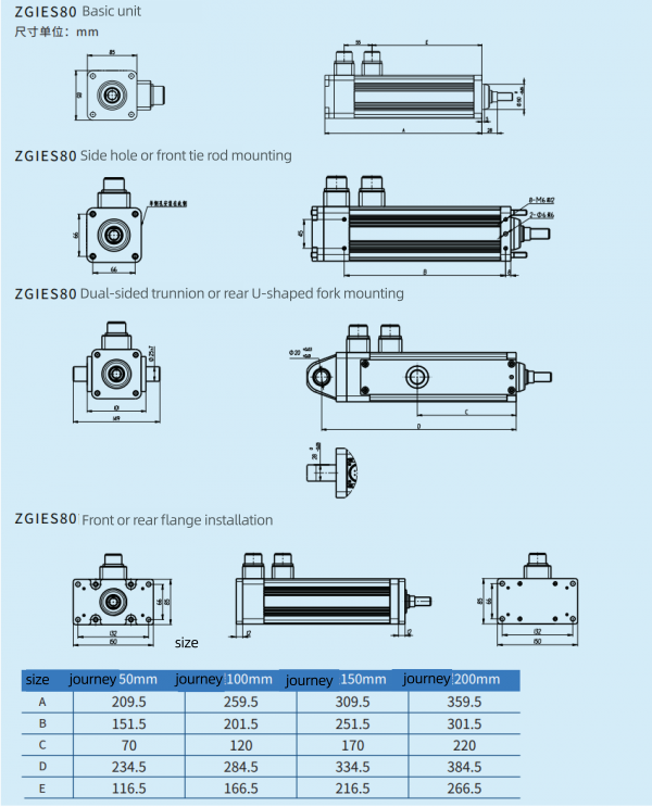 The ZGIES series servo electric cylinders are a new series of products independently developed by Zhige Robotics Systems Co., Ltd. based on market demand. Their flange ranges from 65mm to 220mm, and power ranges from 0.4KW to 33KW. The servo electric cylinders adopt an integrated design of servo motor and planetary roller screw, suitable for motion control systems with low, medium, and high performance requirements.