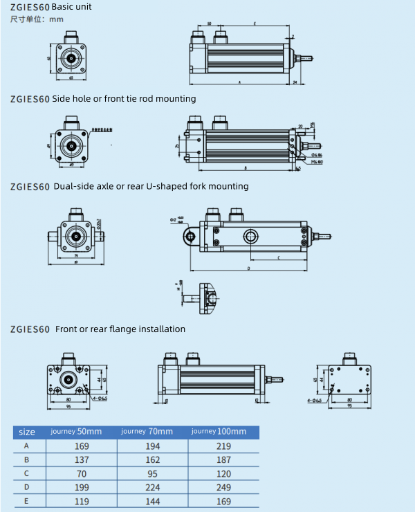 The ZGIES series servo electric cylinders are a brand-new series of products independently developed by Zhige Robotics Systems Co., Ltd. based on market demand. Their flange range is from 65mm to 220mm, and their power range is from 0.4KW to 33KW. The servo electric cylinders adopt an integrated design of servo motor and planetary roller screw, suitable for motion control systems with low, medium, and high performance requirements.